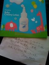 またまたモニターに選んで頂けました今回は赤ちゃんや、妊婦さん、産後ママにも優しい低刺激処方のbaby creamy lotionですまず届いて1番感激しちゃったことわざわざ手書きのメッセージこういうのって、凄く嬉しいですとっても丁寧な会社なんだなって、信頼しちゃいますそして、商品ですがまず、パッ… 2012/04/01
