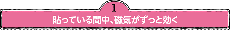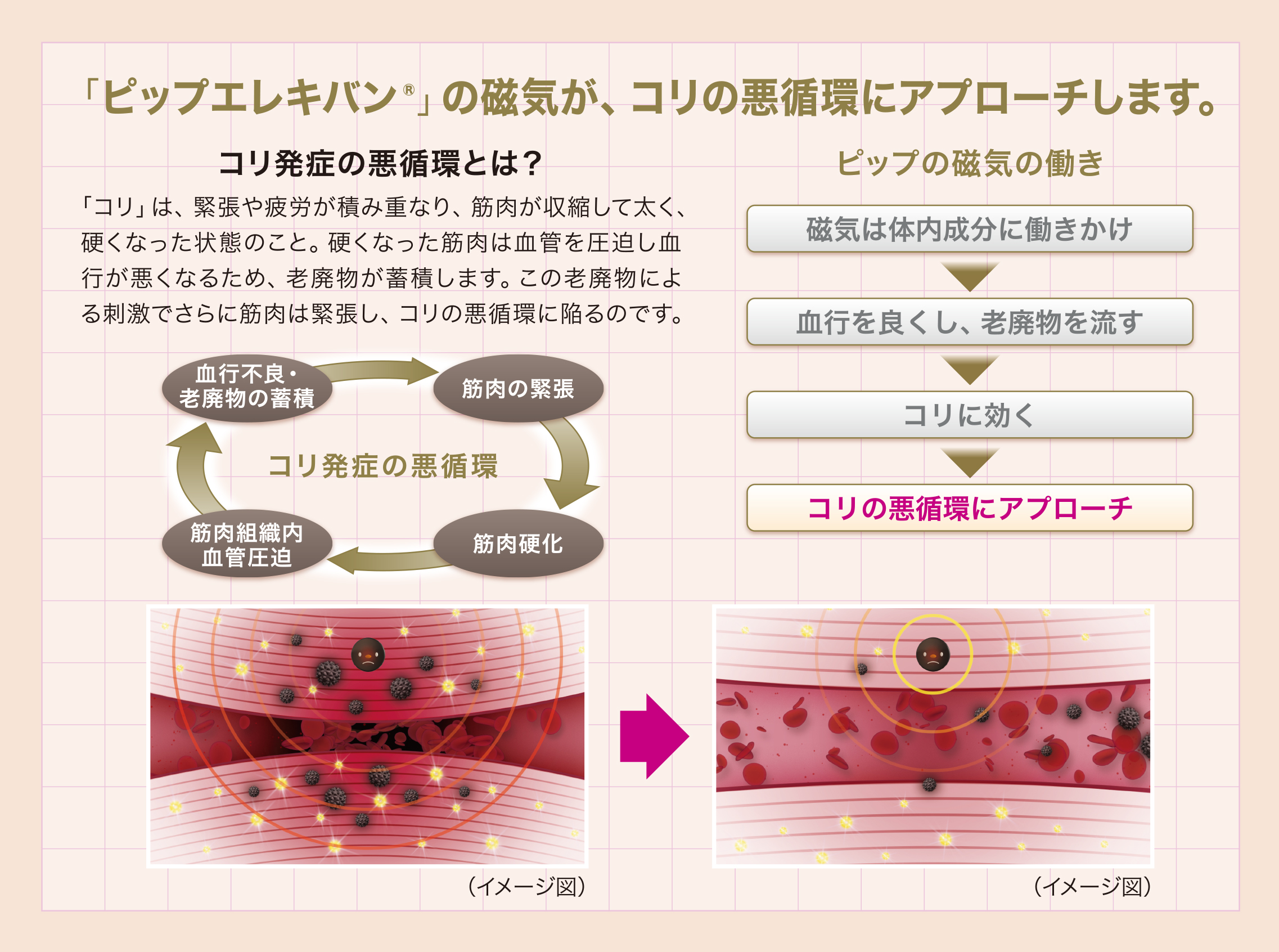 大型円錐磁石使用で磁気が広範囲に届きます。貼っている間中磁気が体内成分に働きかけ、筋肉内の血行を良くします。「老廃物」を流すことでコリの悪循環にアプローチし、コリをほぐしていきます。
