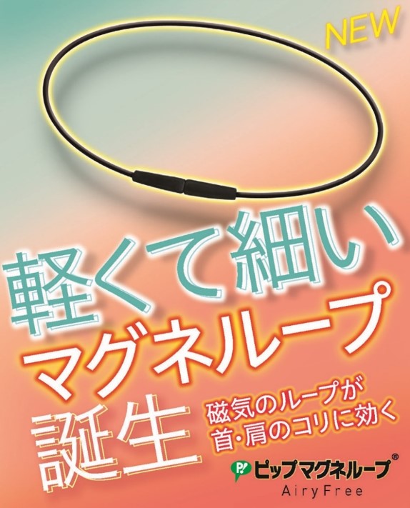 ピップのネックレス型磁気治療器「ピップマグネループAiryFree(エアリーフリー」は、ループが超軽量で超スリム。目立ちにくく、着けごこちストレスフリーに首や肩コリをほぐします!