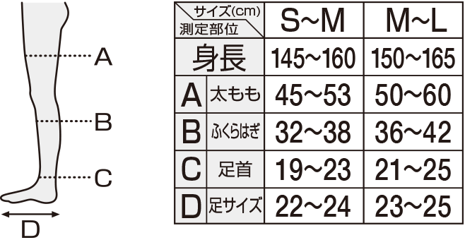※S〜MとM〜Lサイズの両方に該当する場合は、足首が中央値に近い方のサイズをお選びください。