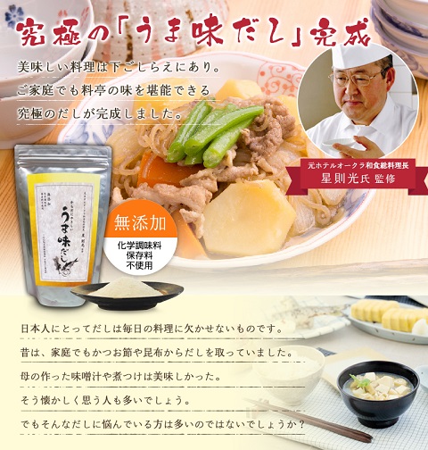 [2015/04/08] 国産無添加だしの決定版!元ホテルオークラ和食総料理長星則光氏監修「うま味だし」