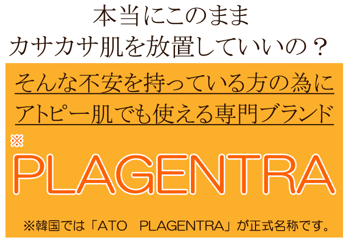 PLAGENTRA(※韓国ではATO PLAGENTRAが正式名称です)はアトピー肌を研究し作られた専門ブランドです。韓国のC・A PHARMから生まれたPLAGENTRAシリーズ。皮膚の角質層の主な機能はお肌のバリア。これが壊れてしまうと外部の刺激物質が流入し、感染症の発生やお肌の水分の損失が加速します。その為、破壊された角質層を回復させ、十分な水分を供給して乾燥肌を改善し、健康肌への回復の手助けをします。
