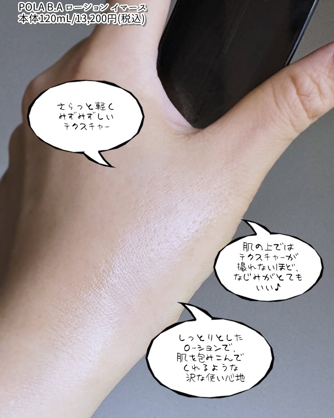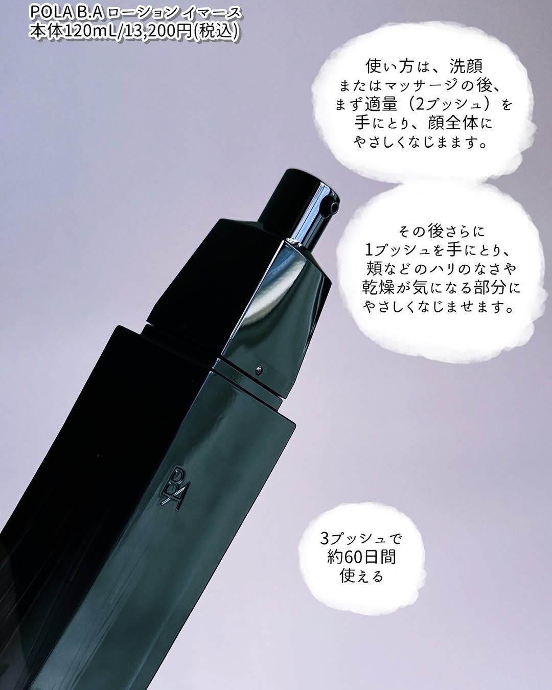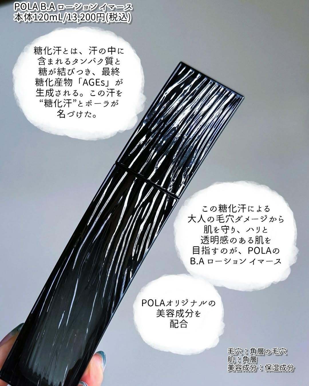 #PR @pola_official_jp ポーラ最高峰ブランドの「B.A」から、大人の毛穴ダメージから肌を守り、透明感あふれるようなハリ肌を目指す保湿化粧水、「B.A ローション イマース」をご紹介。 皆様、「糖化汗」という言葉を聞いたことがございますか? 汗の中に含まれるタンパク質と糖が結びつくと、最終糖化産物「AGEs」が生成されるのですが、ポーラがこの汗を“糖化汗”と名づけました。 「B.A ローション イマース」は、この糖化汗による大人の毛穴ダメージから肌を守り、透明感あふれるようなハリ肌印象を目指す化粧水になります🎶 . . B.Aには「B.A ローション」という美容液のような濃密テクスチャーの化粧水もございますが、こちらはさらりとしたみずみずしいテクスチャーで気軽に使いやすい感じ。 でもそこはさすがB.A。さらさらしていてもしっとりとした化粧水で、肌を包みこんでくれるような贅沢さがあります。 肌にのせたらテクスチャーの写真がうまく撮れないほど、肌なじみがとてもいいのも気に入っています💗 あと、香りもとても贅沢で😍 香りのベースはシプレフローラル調なんですが、B.Aはアイテムごとにそれぞれ香りが少し異なっていて。重ねていくと「シプレフローラルアレンジメント」が完成するんです。 お手入れの時間がまるで香水をまとうような特別な時間へと格上げしてくれますよー🎶 . . B.A ローションは膨らむようなもっちりとしたハリ肌を目指す方向けですが、こちらは毛穴の目立たない、透明感のあるハリ肌印象を目指したい方向け。 お値段も少し手頃なので、B.Aをまずは試してみたいという方にもいいかもしれません☺️ 過酷な夏の暑さや強い紫外線による乾燥が気になると思いますので、こちらの使用をぜひ検討してみてください。おすすめです🎶 . . ✍製品について  ̄ ̄ ̄ ̄ ̄ ̄ ̄ ✔製品名…B.A ローション イマース ✔価格…120mL/13,200円(税込) ✔糖化汗による大人の毛穴ダメージから肌を守り、毛穴の目立たない、透明感あふれるようなハリ肌を目指す保湿化粧水 ✔シプレフローラル調にさわやかなウッディを効かせた透明感をまとうような香りで、みずみずしいうるおいが肌のすみずみまで吸い込まれるような感触。 ✔毛穴のような狭い部分は表面張力の高い水は入りにくく、表面張力の低い汗は入りやすいという特徴に着目し、「インテグレーターミセル」という処方を開発。肌との親和性が高く、表面張力を抑えることで、角層の毛穴部分にもなじみやすい設計を目指しました ✔B.A ローションと共通のエピ・ボリュームカプセルを配合。角層のイオンバランスを整え、水層、オイル層を整えることで、ふっくらとしたハリ・弾力感を与える処方設計です。 . 肌:角層 毛穴:角層の毛穴 毛穴の目立たない、毛穴をケア:うるおいにより角層の毛穴の目立ちにくい肌状態を保つこと ※エピ・ボリュームカプセル※シリカ、アルギニン、ジメチコン、クエン酸、ベヘニルアルコール、グリコール酸、ゼイン(保湿) . . #株式会社ポーラ #POLA #BAローションイマース #保湿化粧水 #monipla #pola_fan #デパコス #毛穴ケア