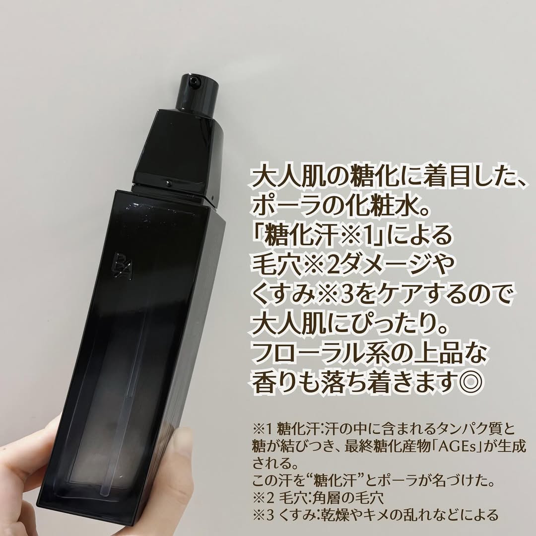 ポーラ B.A ローション イマース 大人肌の糖化汗に着目した、 ポーラの化粧水。 ポーラのスキンケアアイテムが大好きで 特にエイジングケアを気にし始めた30代になってから 色々使ってきたけど、 化粧水を使うのは何気に初めて。 今回惹かれたのが、糖化汗による毛穴ダメージから肌を守り、毛穴ケアとくすみケアができるという点。 毛穴ケアも年々気になるし、 顔にたくさん汗をかくほうなので これはピッタリかもと思い使ってみました。 テクスチャーはさらっと軽めで、さっぱりしているのに しっとりとした使用感。 顔全体になじませたあと 頬など特に乾燥が気になる部分には 追加で重ねづけするのもオススメ。 使用感が良いだけでなく 爽やかなフローラル系の香りも好みで スキンケアの時間が満たされます🌿 今の時期にもぴったりの使い心地なので 使い続けてみたいです。 ※エイジングケア:年齢に応じたお手入れ ※1 糖化汗:汗の中に含まれるタンパク質と糖が結びつき、最終糖化産物「AGEs」が生成される。この汗を“糖化汗”とポーラが名づけた。 ※2 毛穴:角層の毛穴 ※3 くすみ:乾燥やキメの乱れなどによる ※毛穴ケア:うるおいにより角層の毛穴の目立ちにくい肌状態を保つこと #PR #株式会社ポーラ #POLA #BAローションイマース #保湿化粧水 #monipla #pola_fan