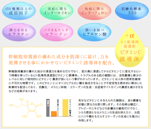 150種類以上の成長因子やサインカイン、白血球より分泌され免疫を担うインターロキシンやSODなど、優れた生理活性効果を持つさまざまな成分が含まれてます。