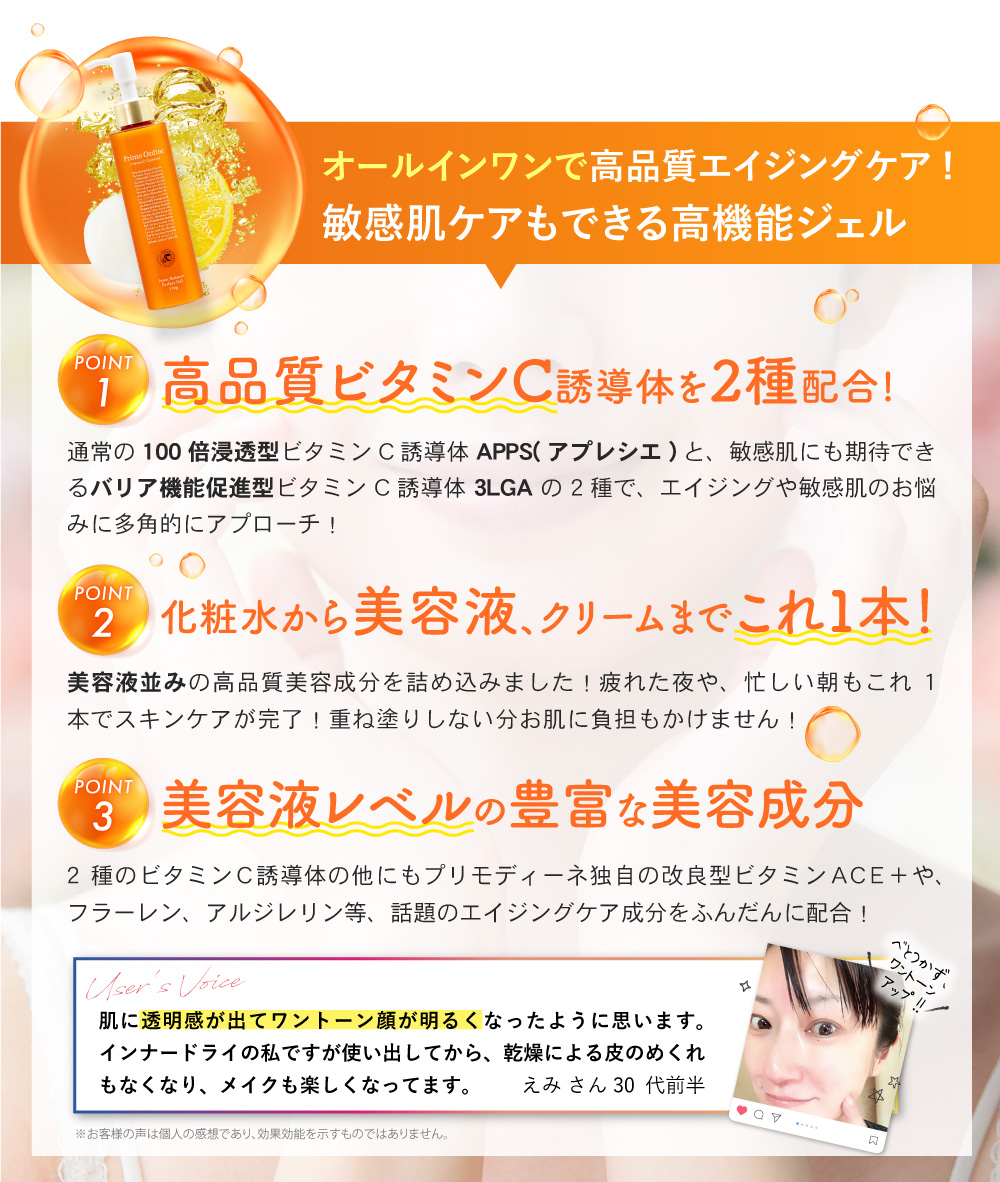 敏感肌ケアもできる高機能ジェル。新型ビタミンC誘導体[3LGA]が、肌が本来持つバリア機能をサポートし、揺るがないハリ肌に育てます。