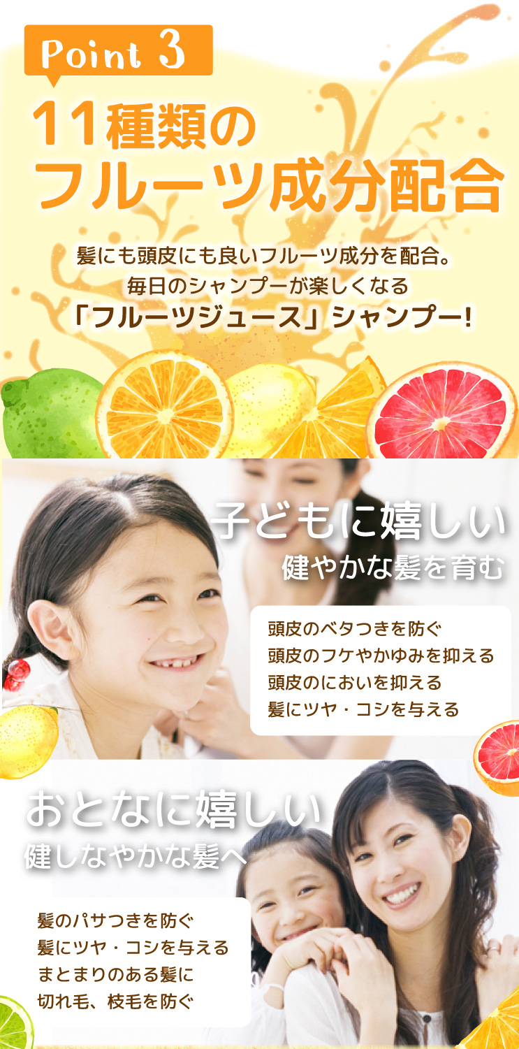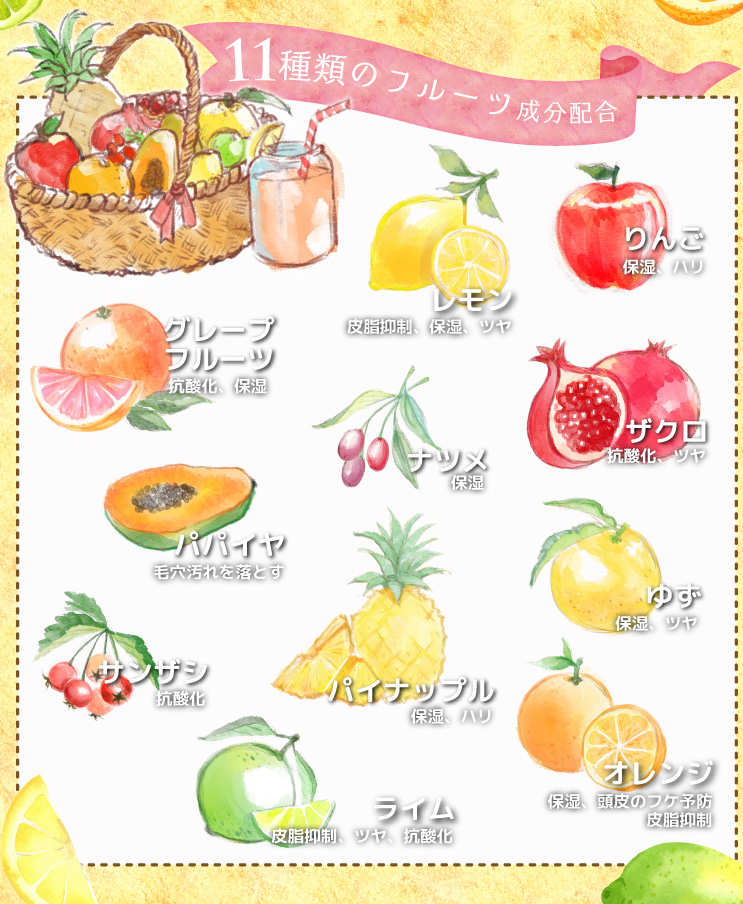 他にも、様々な効果が期待できる11種類のフルーツ成分をたっぷりと配合した「フルーツジュース」シャンプーとなっております。