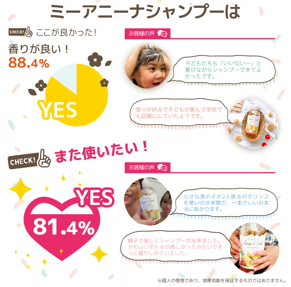 アミノ酸洗浄成分+天然の洗浄成分(ソープナッツ)の優しい泡で洗い上げ、これ一本でしっとりサラサラな仕上がりに。 弱酸性なので、敏感肌の大人の方や小さなお子様にも安心してお使いいただけます。 他にも、様々な効果が期待できる11種類のフルーツ成分をたっぷりと配合した「フルーツジュース」シャンプーとなっております。 レビュー数 : 121 |
