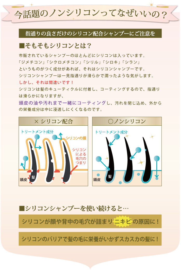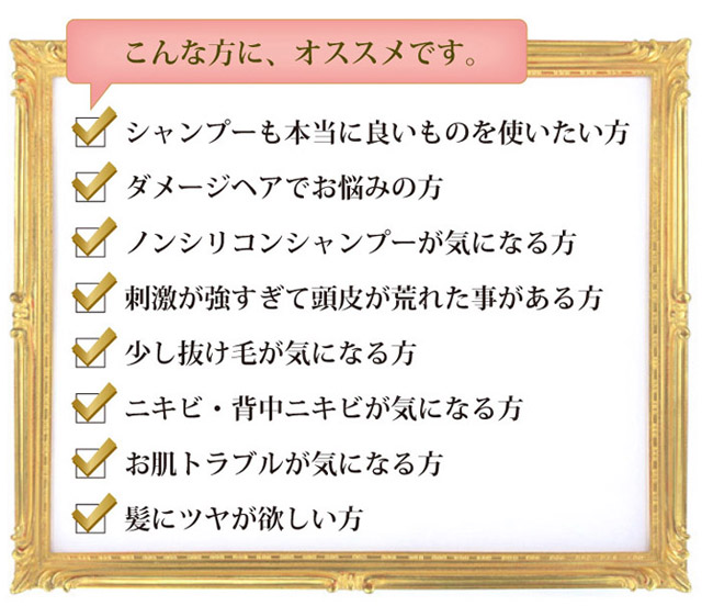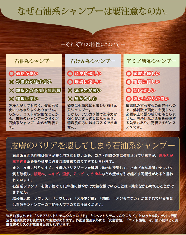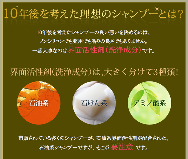 10年後を考えた髪と頭皮、そしてお肌にも安心の天然系アミノ酸ノンシリコンシャンプー。お肌のトラブルが気になる方にもオススメのトライアルセット