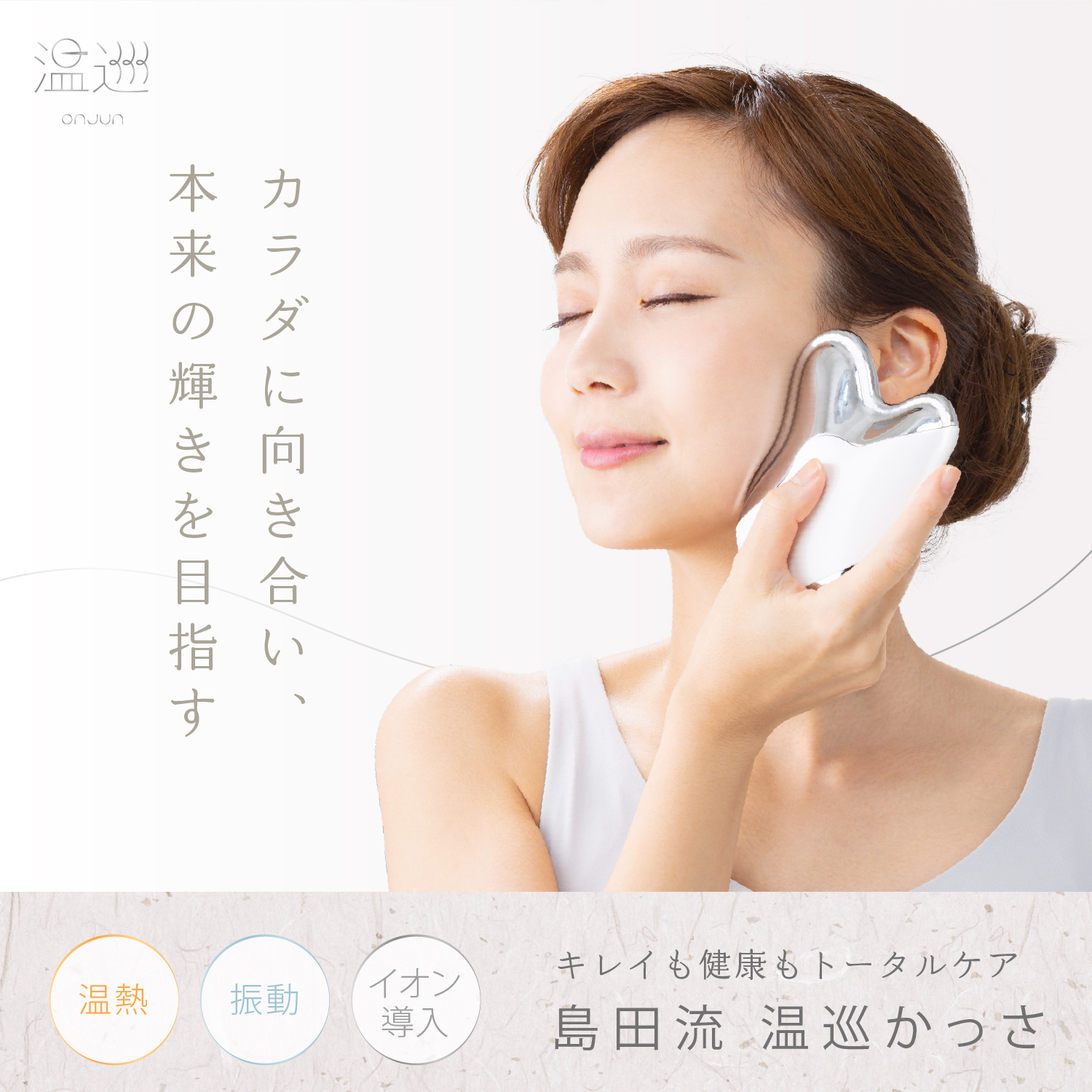 めぐりを整えて、美容も健康もトータルにケアする電動かっさ。日本にかっさを広めた第一人者・島田淑子さんと共同開発。理想の形状にこだわり、温熱・振動・イオン導入の3つの機能を搭載した究極のかっさが誕生。初めてかっさを使う方にも使いやすいシンプルな設計が魅力です。