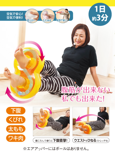 手軽にどこでも、気が向いた時にできるエクササイズアイテム 「エアエクサ」シリーズが、2014年夏5商品登場! 名前の通り、エア=空気を入れて膨らませ、内臓されたボールを コロコロと転がすだけの簡単エクササイズアイテム。 レビュー数 : 29 |