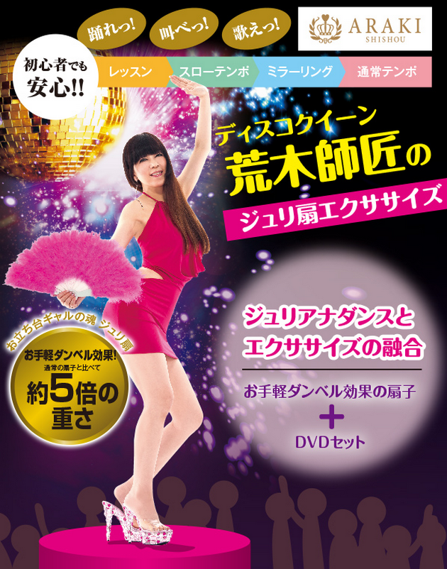 ★ ディスコクイーン荒木師匠のジュリ扇エクササイズなのです!!(✪▽✪)バブル時代にタイムスリップ!エクササイズなのです!!ダンスDVDと特殊ジュリ扇がセットになったジュリ扇エクササイズで20年前のメリハリボディーを取り戻す!価格(税込): 7,538 円※今まで買ったエクササイズのDVDは??やは… 2015/01/06