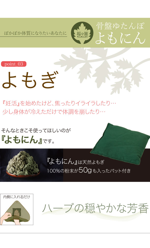 よもにんはお湯を注ぐだけでできる簡単リラックス習慣。3D構造で下腹部を包み込んであったかくし、冷えすぎた腰周りからじんわりポカポカ。天然よもぎ100%の専用パッドを内側に入れてお使いいただけます。