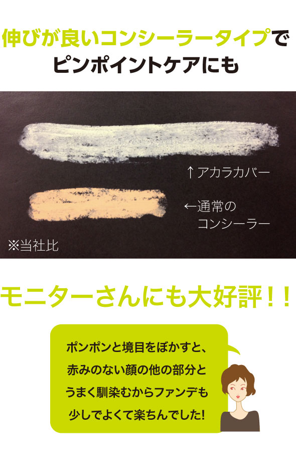 私、皮膚が薄いらしく、 興奮したりするとボッと顔が真っ赤になるんです ファンデ塗ってても、目に見えて赤くw どうにかできないかなーと思っていたところ、 ぴったりなアイテム発見 アカラカバー 日本人女性に多い「赤ら顔」のためのコンシーラー 皮膚の薄い日本人の肌特徴を考え、 選び抜かれ… 2013/03/06