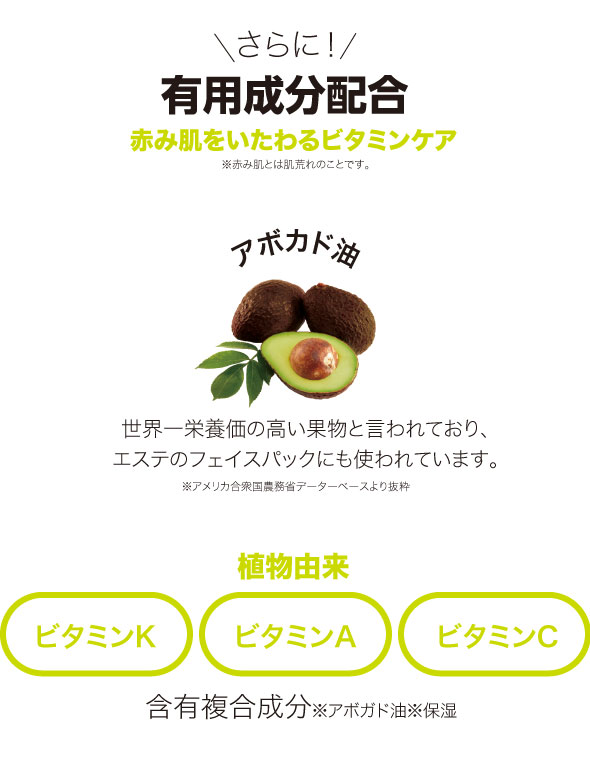 8種類のミネラルと10種類のビタミンを含む、アボカド油が赤みの原因にアプローチ。肌のリズムを促して、自然な肌の状態へ導きます。