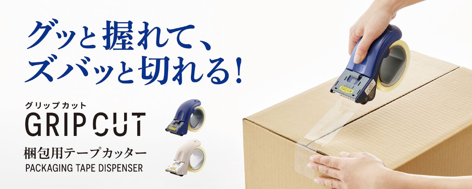 梱包用テープカッターの「連続して使うと手への負担が大きい」「テープが巻き戻ってしまう」「テープのセットが難しい」などの不満を解消した、「グリップカット」。