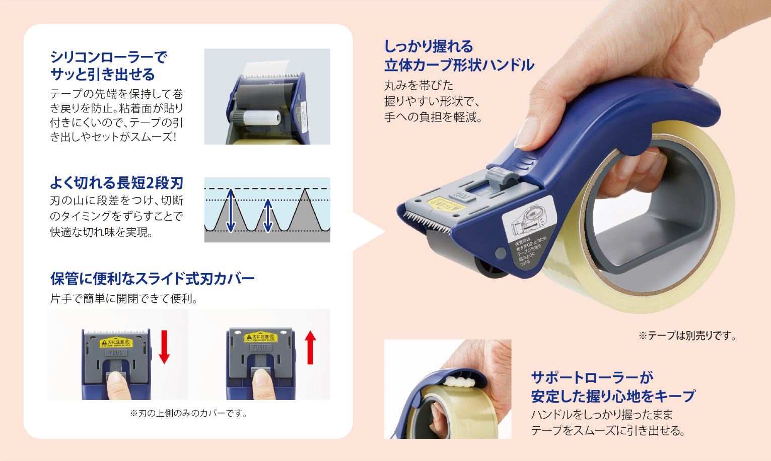 しっかり握れる立体カーブ形状ハンドルが手の負担を軽減し、サポートローラーがハンドルを握ったままテープをスムーズに引き出して、安定した握り心地をキープします。