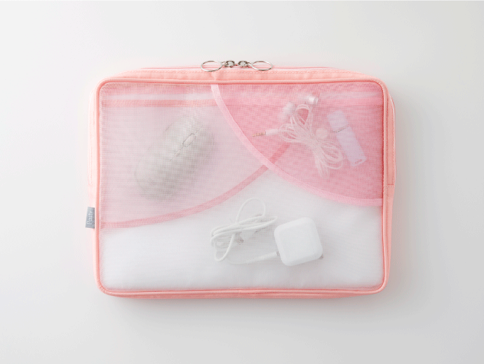中身を確認しやすく、軽やかな印象のメッシュ素材。軽量で持ち歩きに便利です。