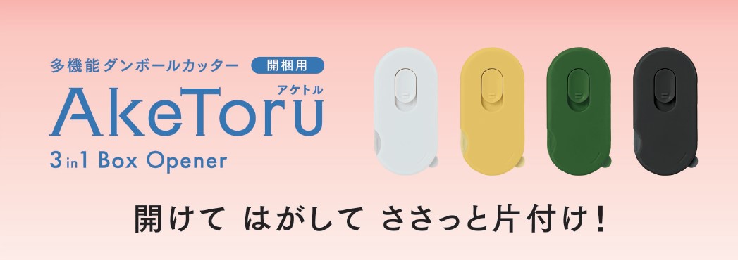 段ボールの開梱からラベルはがし、片付けまで、誰でも簡単にストレスなくできる開梱カッター「多機能ダンボールカッター 開梱用 アケトル」です。