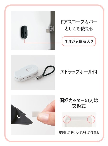 本体はマグネットを内蔵し、玄関ドアや冷蔵庫などに貼り付けて保管が可能です。裏面にはくぼみがあり、玄関のドアスコープに被せて、ドアスコープカバーとしても機能。