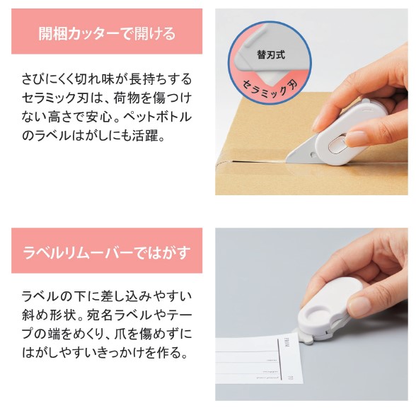 荷物の中身を傷つけにくくするため、セラミック刃は、段ボールの厚さに合わせて刃の高さを短く固定。また、ラベルやシールの端をめくりやすくするため、ラベルリムーバーを備えています。