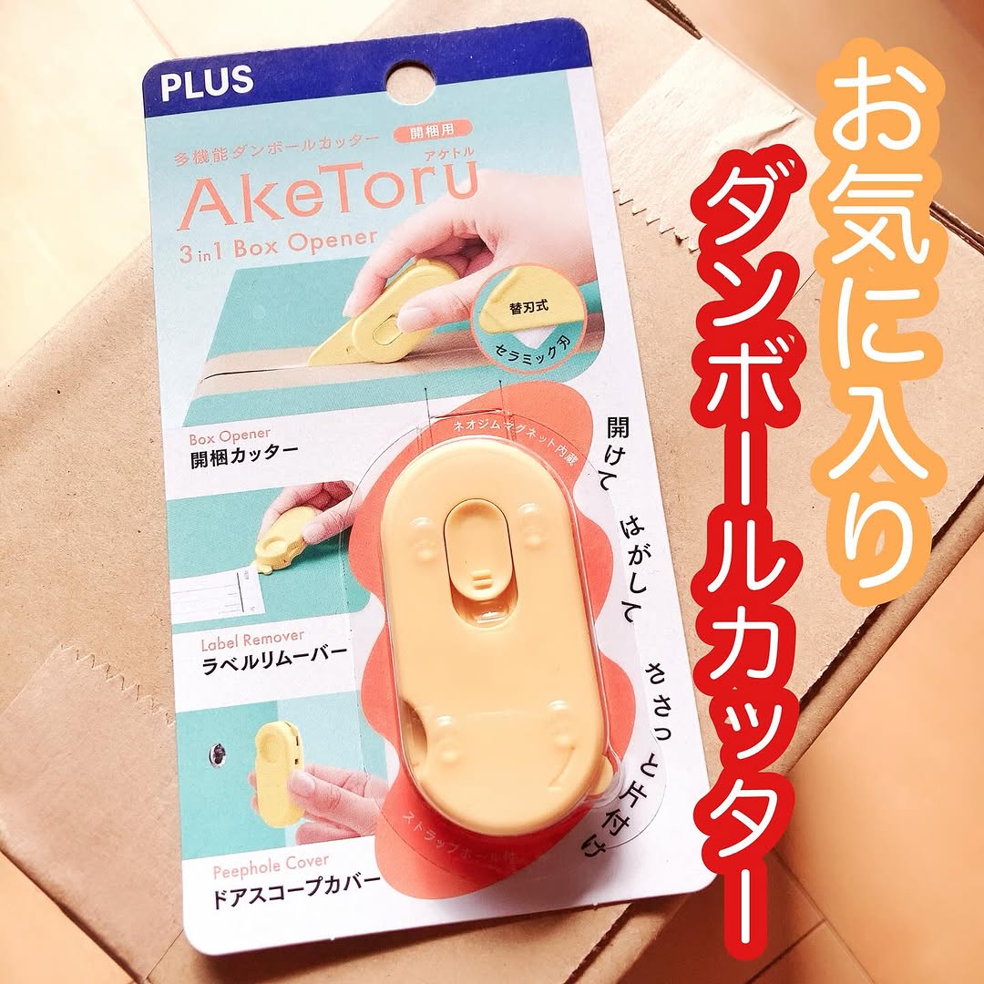 * * 多機能開梱用ダンボールカッター うちの子供達は荷物が届くと興味津々! 中が何であろうと、近くに寄って来て覗き込む😂 子供が近くにいる時カッターやハサミを使う のって怖いよね😱 だから最近『アケトル』を使ってます! 開梱式でセラミック刃で段ボールの厚さに 合わせて刃の高さを短く固定している のでなんだか安心感😊 軽くて小さくて持ちやすい上 しっかり切れ味で明るいイエローカラーも お気に入りです❣️ 刃が短いから荷物の中身を傷つけにくく ラベルやシールの端をめくりやすくするた め ラベルリムーバーも備えていて 爪も傷つかなくて済むよね🥰 冷蔵庫や玄関ドアにマグネットで 貼り付けて保管できるから 子供の手の届かない場所に保管できて良き◎ #PR #プラスステーショナリー #開梱カッター #アケトル #プラス #monipla #psc_fan