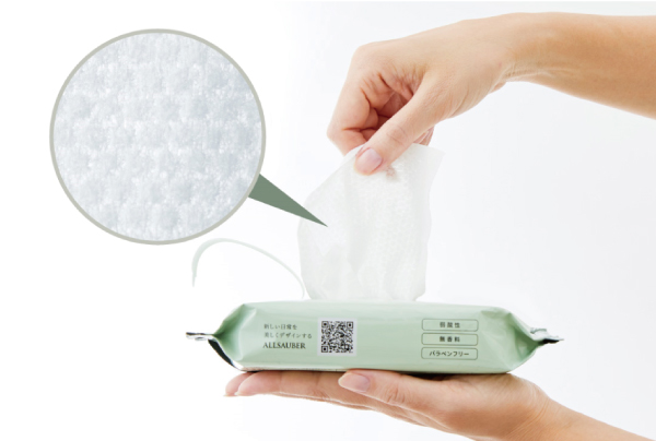 水分を多く含み乾きにくい厚手のシートを採用しました。表面がエンボス加工になっているため、しっかりと汚れを拭き取ることができ、1枚で広い範囲にご使用いただけます。やわらかさがあり、肌触りも良いシートです。