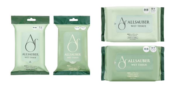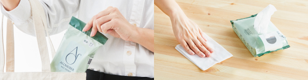 外出先での手指の汚れの拭き取りや、共用物に触れる際にサッと取り出すことができる携帯用と、お食事前のテーブルや、オフィスの会議室など、広い範囲を1枚でたっぷり拭ける大判タイプを用意。用途に合わせてお選びいただける、充実のラインアップです。