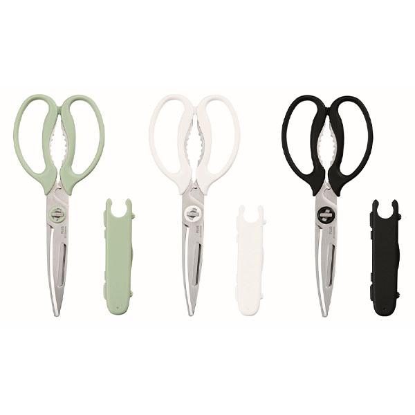 ■1本ではさみ以外の「ピーラー」「栓抜き」「補助ナイフ」「ふた回し」の機能を備え、日々のお料理やアウトドアでのいざという時をサポートします。はさみ1本で完結するので、場所をとらずに収納することが可能です。
