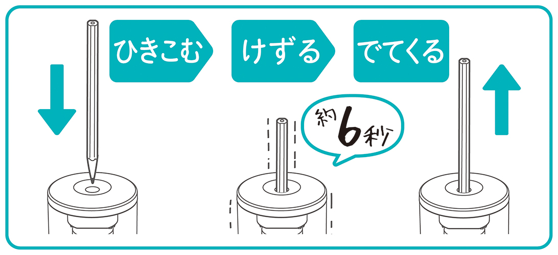 ①自動的に鉛筆を引き込み、削り、出てくる。1本約6秒!