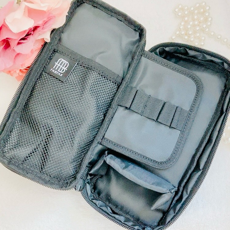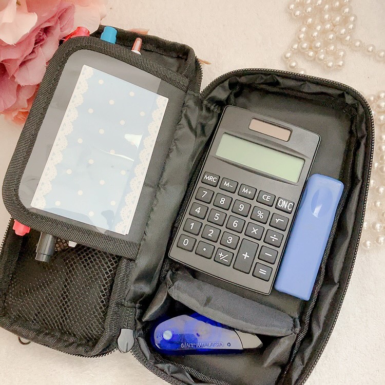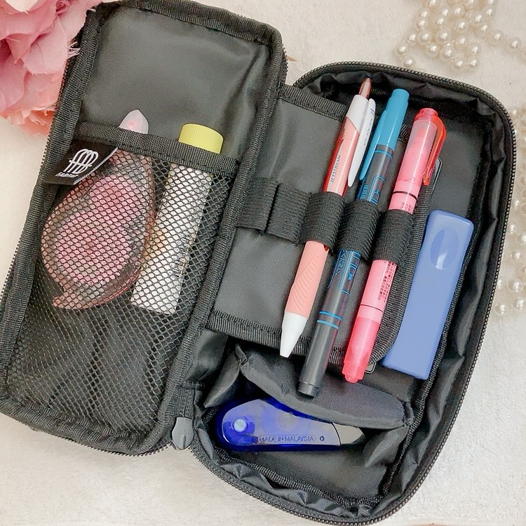 ペンを1本ずつ収められるホルダーが中心にあり、メッシュポケットやクリアポケット、仕切り付きの収納もあるので使いやすいです♪