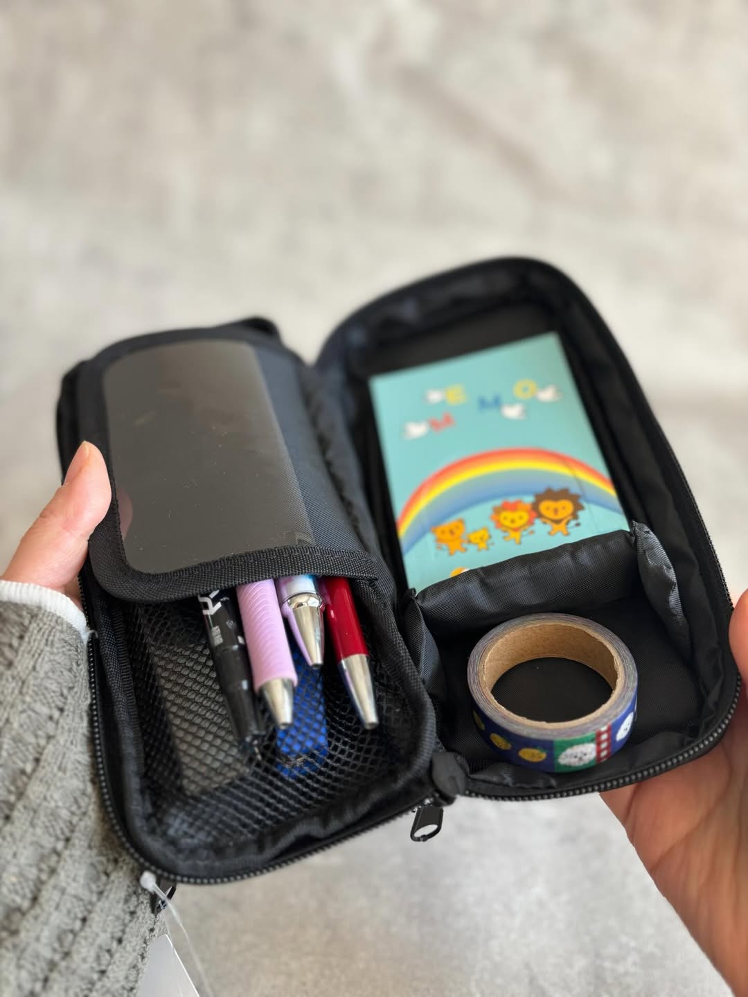 外ポケットが付いていて、内側には、1本1本ペンが入れられるホルダー、仕切りが。