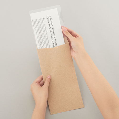 2018年10月24日に発売した、「ぴったりすっきりホルダー」は、定形郵便で一般的な長形3号、長形4号、洋形2号の封筒にすっきり入るぴったりサイズ。書類はそれぞれA4横三つ折、B5横四つ折、A4縦横四つ折で収められます。お取引先へ送る際にシワや水濡れが心配な見積書や請求書も、定形郵便で送ればA4クリアーホルダーを使用した定形外郵便に比べ、郵便代を削減できます。汚れや折れ厳禁な写真も、封筒の中でしっかり守り、安心してお友達へお渡しできます。