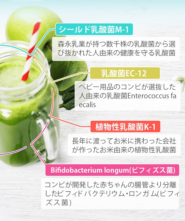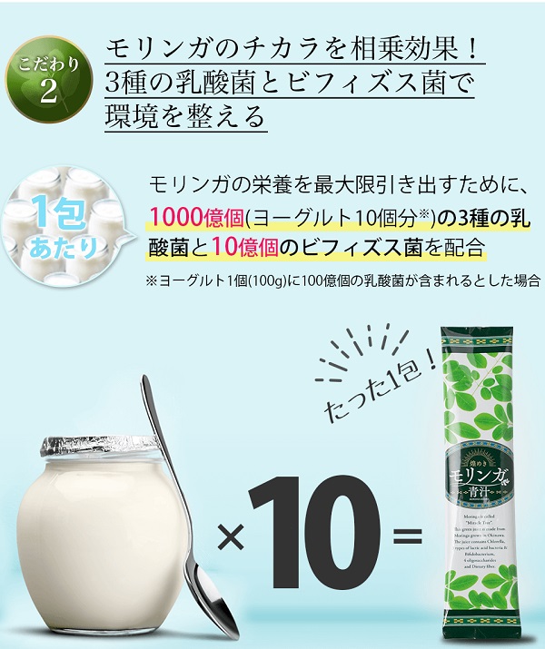「煌めきモリンガ青汁」は、「奇跡の木」と言われる沖縄産の手摘みモリンガ葉を主原料にして石垣島産クロレラ・3種類の乳酸菌・ビフィズス菌・4種類のオリゴ糖さらに水溶性食物繊維を配合したすっきり飲みやすい青汁です。1包あたり乳酸菌は1,000億個配合しました。