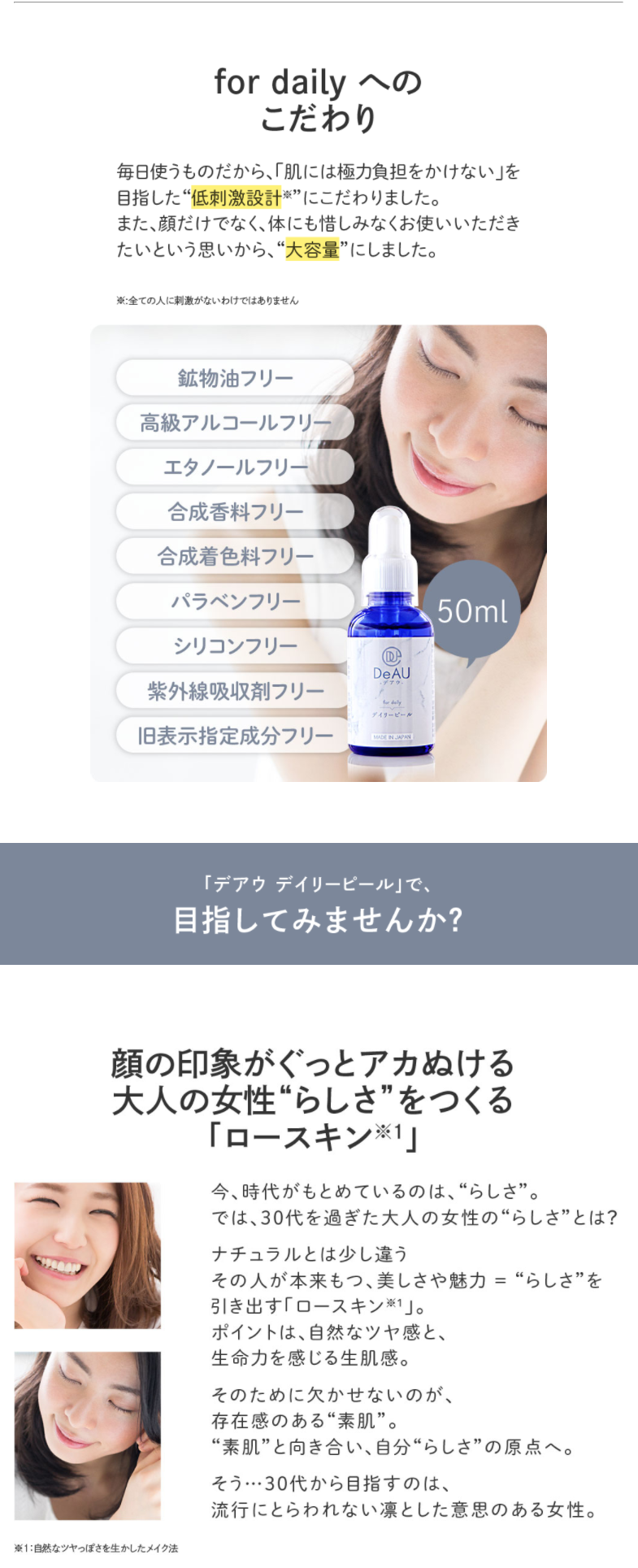 肌リズムにあわせて毎日お使いいただくことを目的としているので、肌に極力負担をかけないよう「低刺激(鉱物油フリー・高級アルコールフリー・エタノールフリー・合成香料フリー・パラベンフリー・シリコンフリー・紫外線吸収剤フリー・旧指定成分フリー)」にもこだわりました。