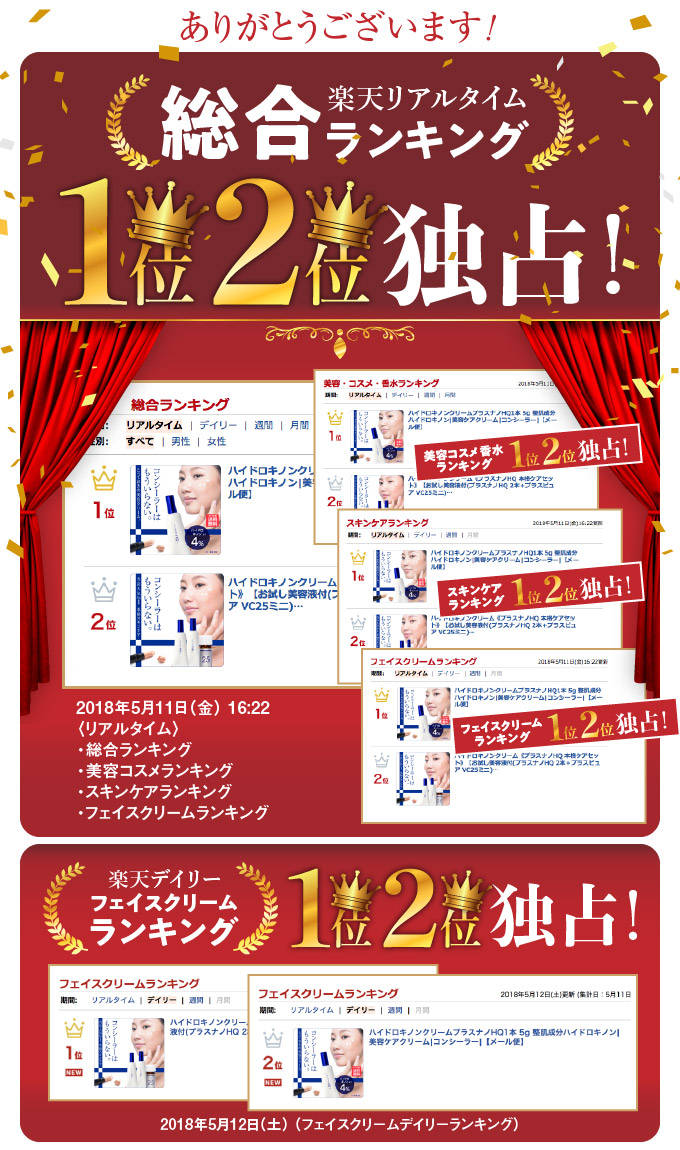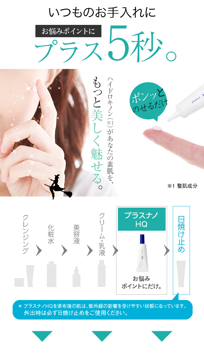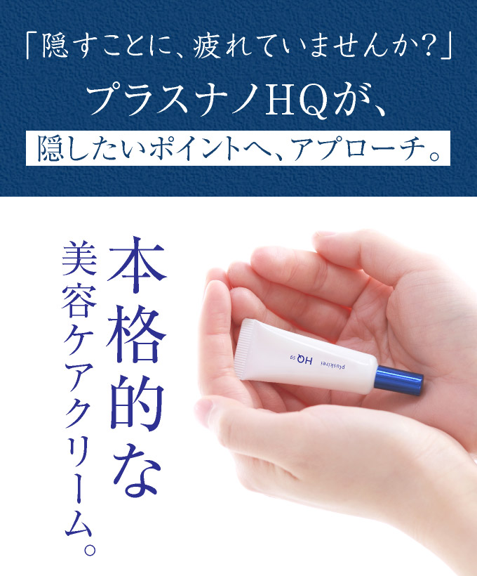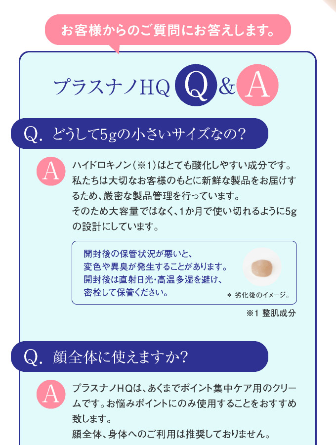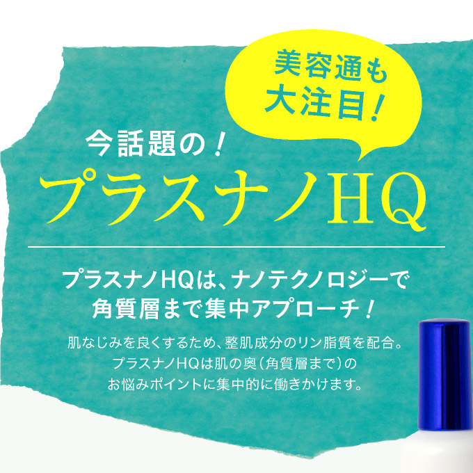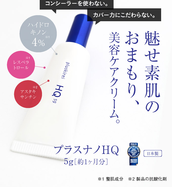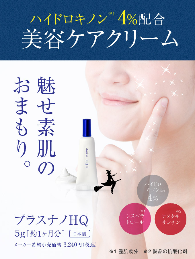 プラスキレイのプラスナノHQは、話題の「ハイドロキノン(※1)」を4%配合、そして、肌のキメを整える「レスベラトロール(※1)」や「アスタキサンチン(※2)」も配合、さらにビタミンA(※1)、ビタミンC(※1)、ビタミンE(※1)も入った美容ケアクリームです。
