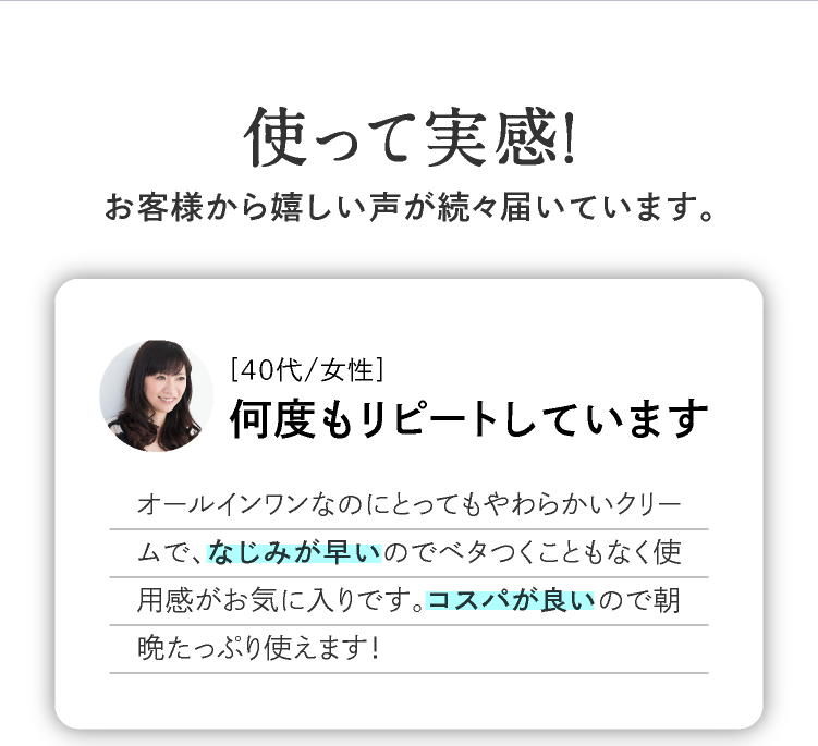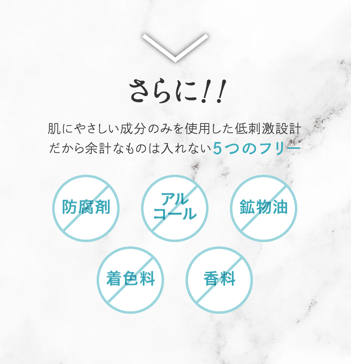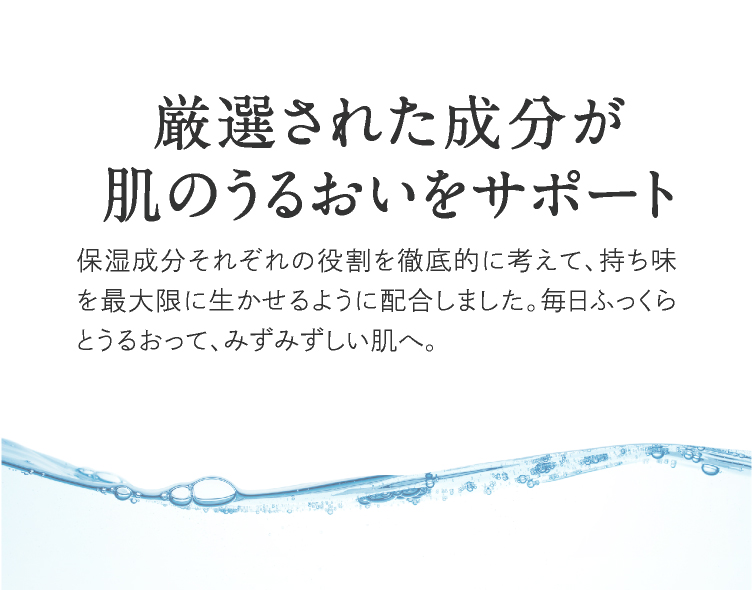 スキンケアの基本である「保湿」に徹底的にこだわり、 肌にやさしい成分のみを使用した低刺激設計です。