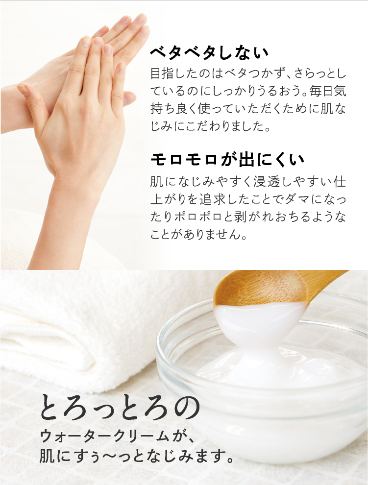 ベタベタしない・モロモロが出にくい、とろっとろの“ウォータークリーム”が、すばやくしっかりと浸透し、みずみずしくうるおった肌に導きます。