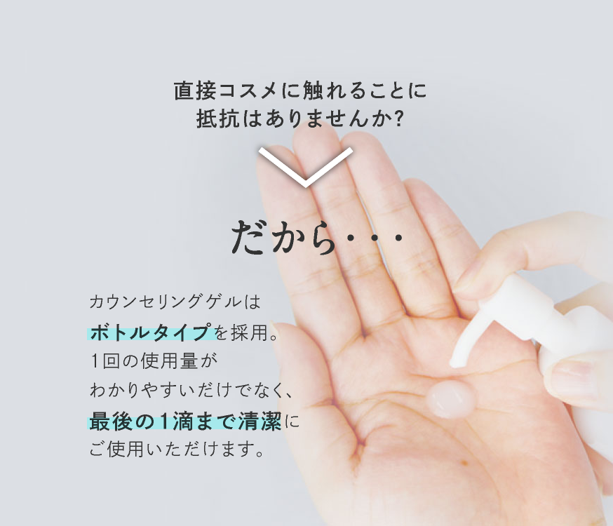 衛生的に使えるボトルタイプですので、直接コスメに触れることに抵抗がある方でも安心。1回の使用量がわかりやすいだけでなく、最後の1滴まで清潔にお使い頂けます。