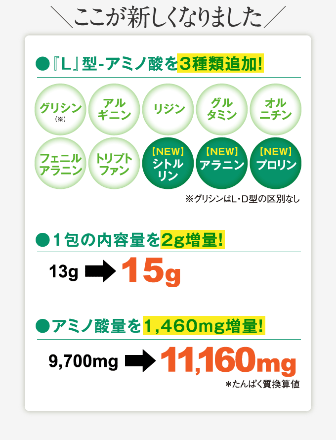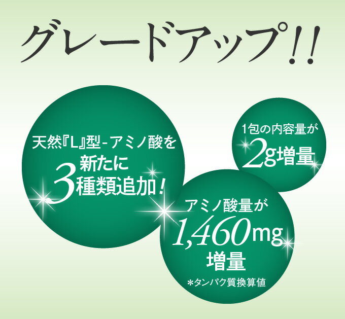 元気とキレイの素、カラダに必要なタンパク質を構成するアミノ酸を主成分とし、エイジング&ヘルスケアにぴったりの独自の配合バランスで誕生した粉末タイプのアミノ酸サプリメントです。