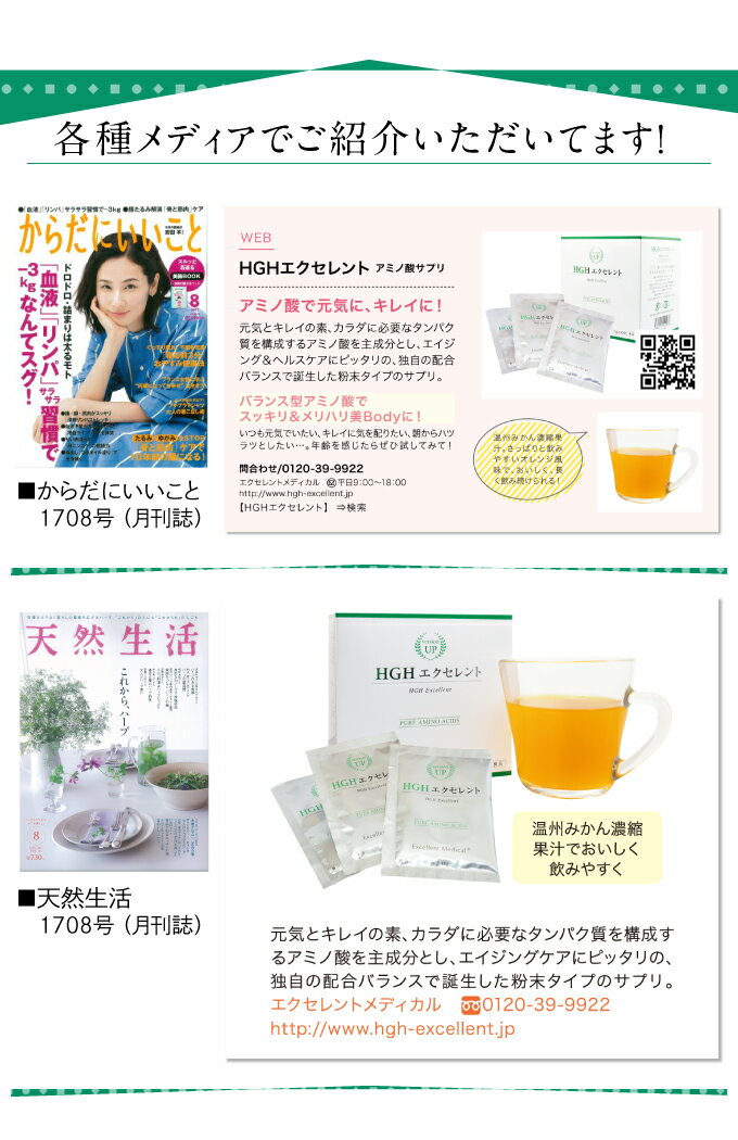 ご存知でしたか?「アミノ酸」は美容と体の元気にとても重要なんです。体の水分を除いた3分の1がタンパク質といわれていますが、そのタンパク質は様々な「アミノ酸」の組み合わせでできています。「アミノ酸」には、体内でつくることができる非必須アミノ酸と、食事やサプリメントから摂取しないといけない必須アミノ酸があります。HGHエクセレントは10種類のアミノ酸を独自に配合し、直接摂ることができます♪♪