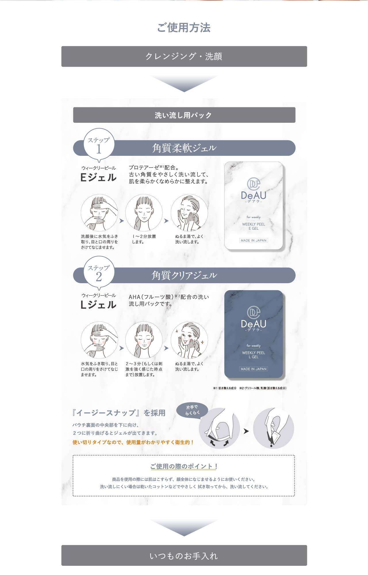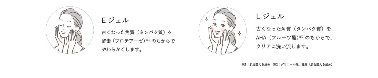 週に1回、“Eジェル”と“Lジェル”のご使用で、通常の洗顔では落としづらい古い角質を柔らかくし、汚れも一緒に落としやすくします。基礎化粧品の浸透力※3もアップし、化粧ノリのよい、つるつるお肌へ導きます♪