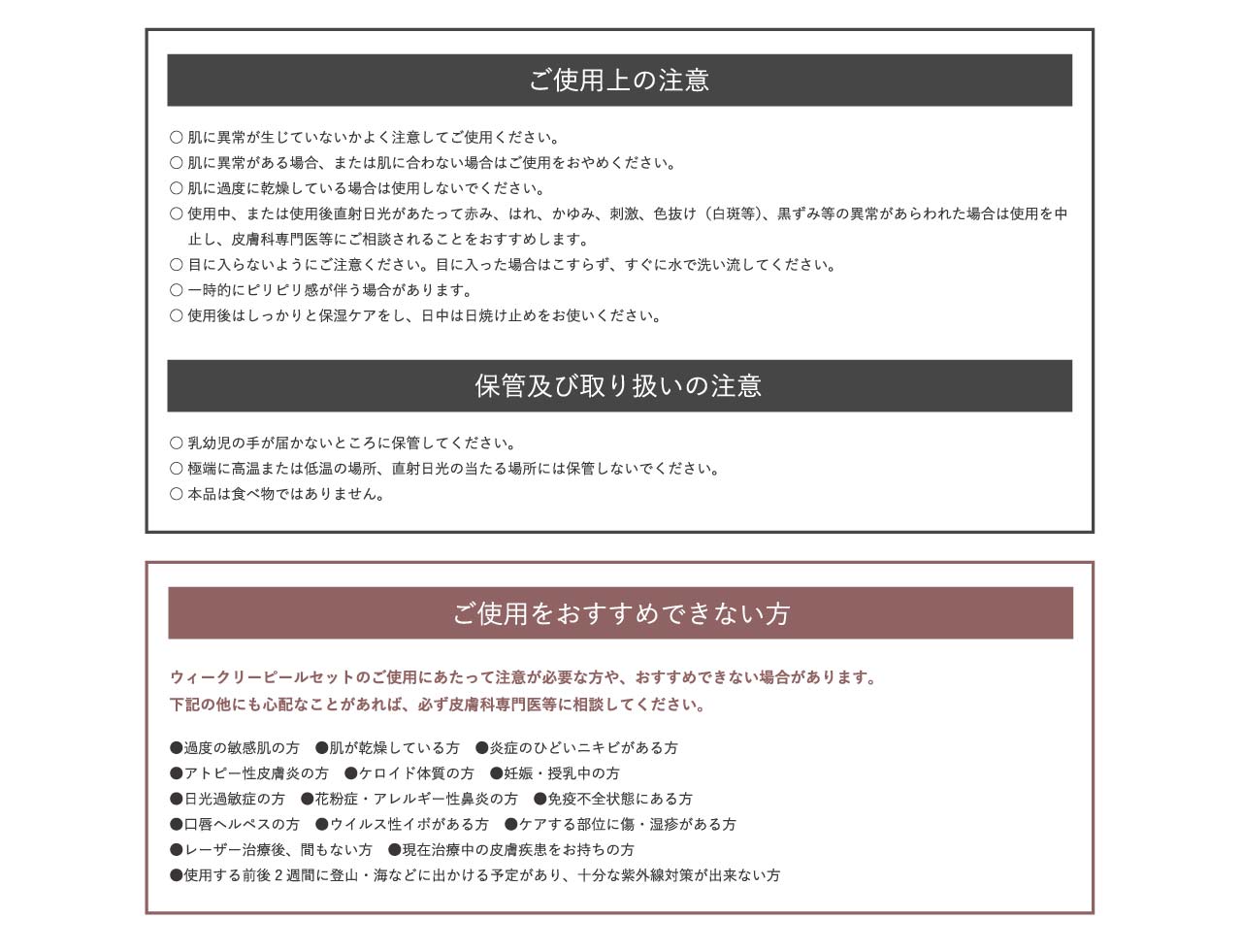 過度の敏感肌の方。肌が乾燥している方。炎症のひどいニキビがある方。アトピー性皮膚炎の方。ケロイド体質の方。妊娠・授乳中の方。日光過敏症の方。花粉症・アレルギー性鼻炎の方。免疫不全状態にある方。口唇ヘルペスの方。ウイルス性イボがある方。ケアする部分に傷・湿疹がある方。レーザー治療後、間もない方。現在治療中の皮膚疾患をお持ちの方。使用する前後2週間に登山・海などに出かける予定があり、十分な紫外線対策が出来ない方。