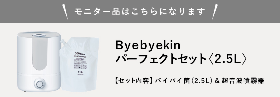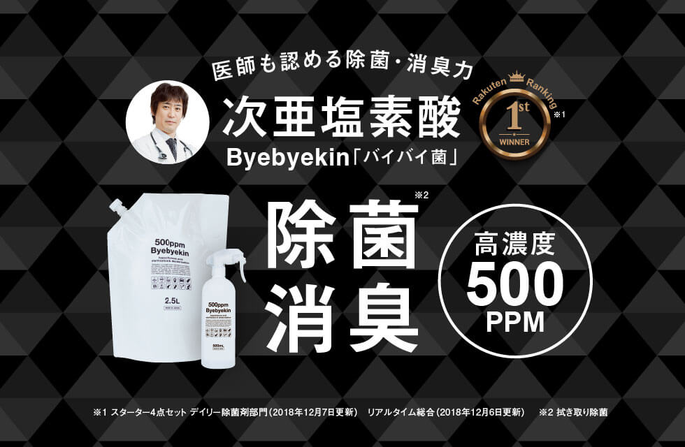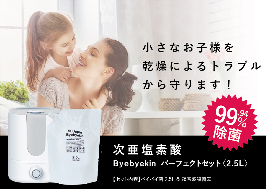 「バイバイ菌」は水と塩、二酸化炭素から生まれた弱酸性の除菌・消臭剤です。濃度は500ppmです!希釈することで、様々な用途に使うことができます。原液のまま使うと吐しゃ物やトイレ、生ゴミに。10倍希釈にすると赤ちゃん用品やペット用品にもお使いいただけます。また、専用の超音波噴霧器を使うと、室内で99.9%の空間除菌と加湿の効果があります。これからの季節、乾燥・風邪・インフルエンザ・大掃除などにお使いください。