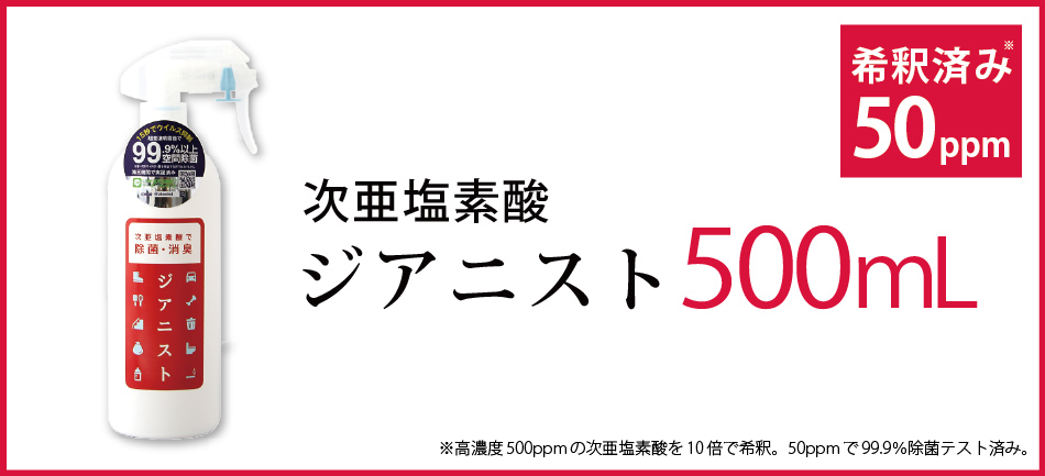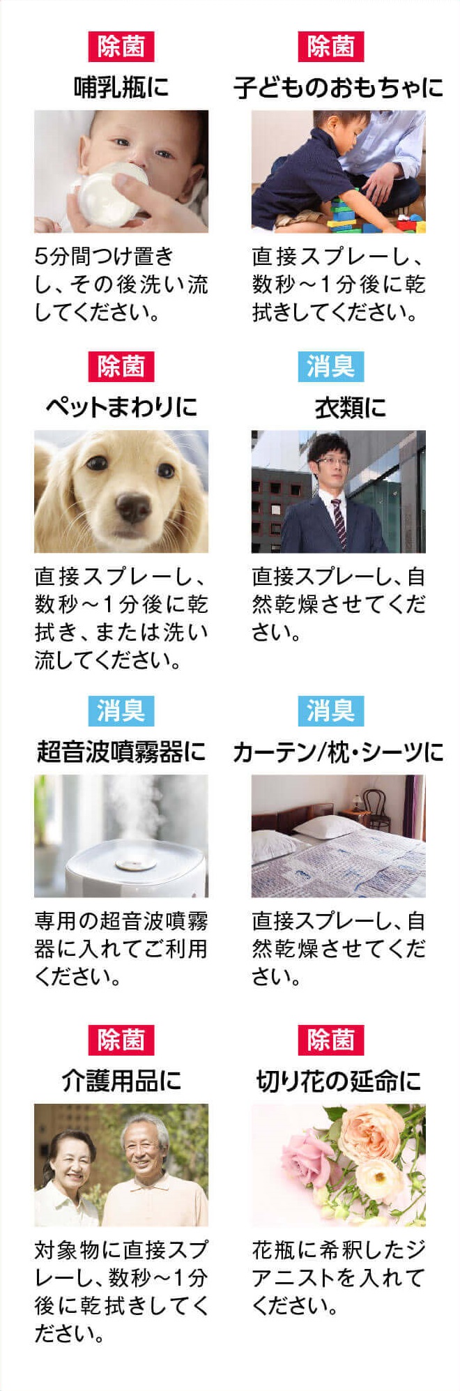 原液の場合は、吐しゃ物・ペットの汚物・カビ等の除菌・消臭に、また10倍(50ppm)に希釈すれば部屋中の幅広い除菌・消臭剤として使えます。