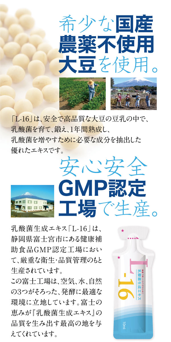 L-16は、毎日スッキリしない、健康・美容を気にする方におすすめの身体環境を整え、体をケアするサプリメントです。 農薬不使用の国産大豆を使用し、 植物原料100%で無香料・無着色・保存料不使用、乳成分不使用の乳酸菌生成エキスです。 乳酸菌生成エキスは、赤ちゃんのときからあなたの体の先駆者を応援します。また生きたものではないので、胃酸などで変わることもなく腸に届きます。 レビュー数 : 51 |