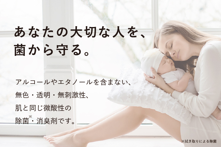 次亜塩素酸は水、塩、二酸化炭素からできた、アルコールやエタノールを含まない、無色・透明・無刺激性、肌と同じ微酸性の除菌*・消臭剤です。