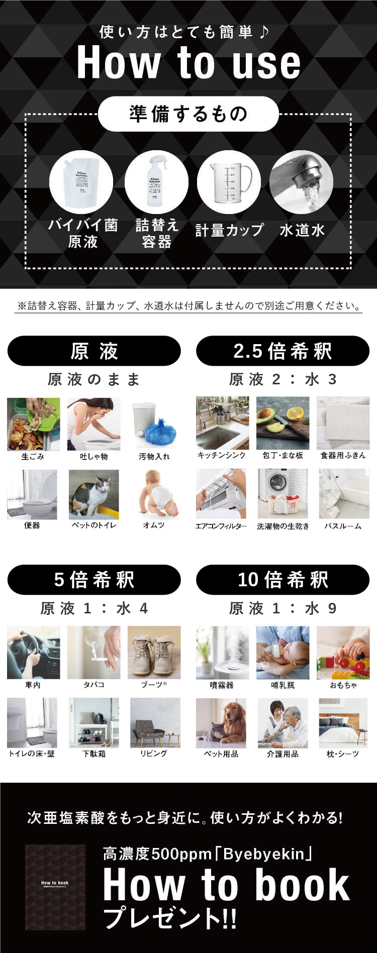 原液のまま、または水で薄めることで、嘔吐物の処理やトイレ周り、キッチン周り、寝室、赤ちゃん用品、ペット用品など幅広いものの除菌*・消臭にお使いいただけます。また、専用の加湿器を一緒に使用することで、室内空間をまるごと除菌*・消臭・加湿することができます。