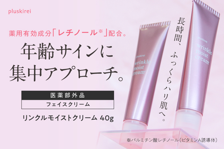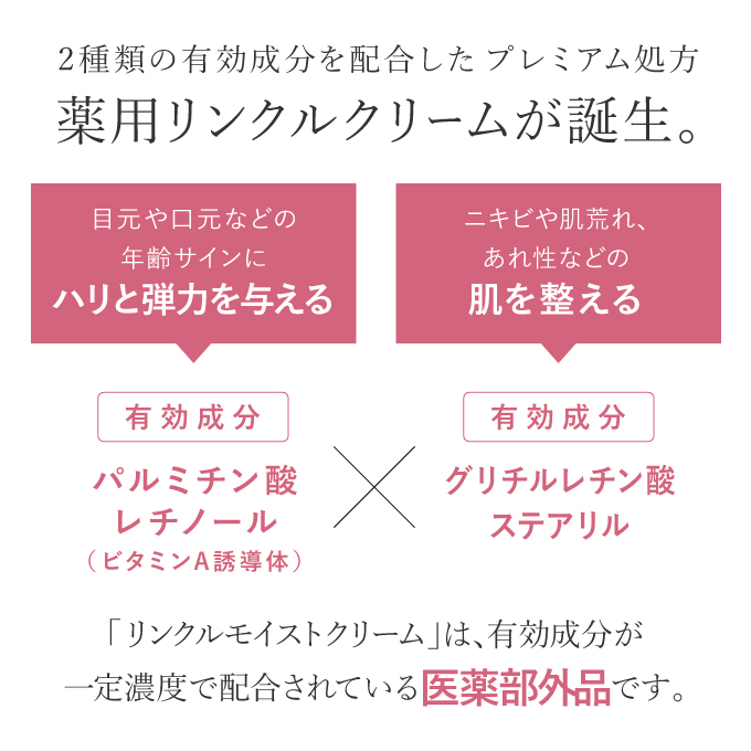 薬用有効成分「レチノール*」を配合した、薬用リンクルクリームです。「レチノール*」は万能ビタミンとも呼ばれ、高い活性力を持ち、肌に輝きを与える美容成分として着目されています。目元や口元などにできる頑固なお悩み、くすみやキメの乱れ、たるみなどの年齢サインに働きかけます。肌をひきしめて、肌にハリと弾力を与えます。また、抗炎症作用のある薬用有効成分「グリチルレチン酸ステアリル」も配合。ニキビや肌荒れ、あれ性、ひび、あかぎれなどの炎症を防ぎ、肌を整え、ツヤのある肌へと導きます。