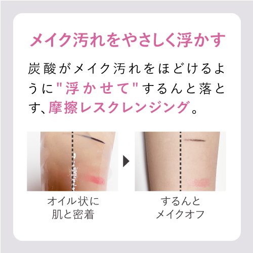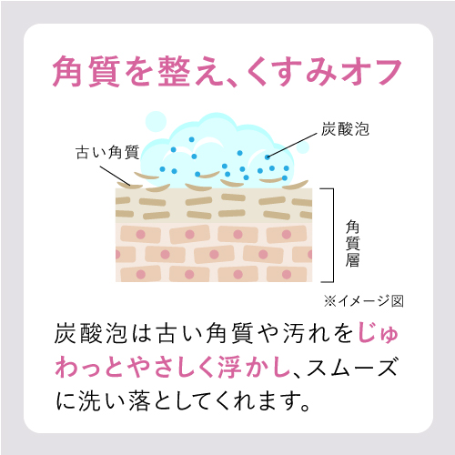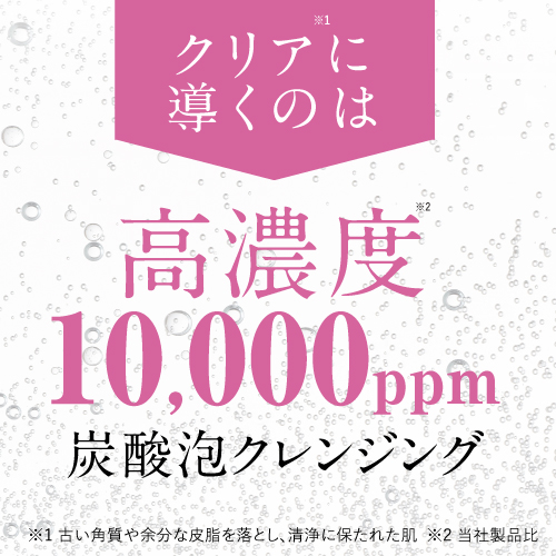 メイク落としだけでなく、古い角質や汚れをやさしく浮かし、スムーズに洗い落としてくれます。また小さい炭酸の粒子が毛穴奥(※2)の隙間にまで入り込み、洗顔では届きにくい汚れもするんとオフ。1日の肌ストレスを高濃度(※1)炭酸がやさしくリセッ トし、くすみ(※3)のない澄んだ(※4)肌へ。